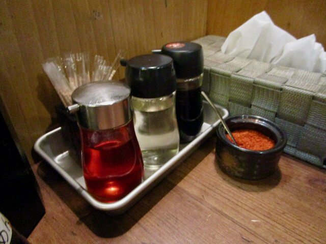一味、七味、唐辛子パウダーなどが置かれています。