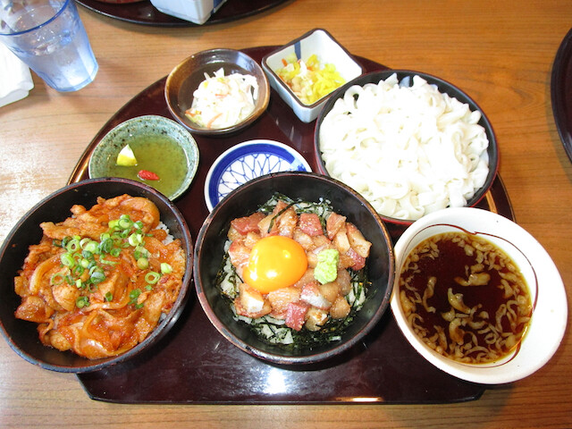 ミニブリ漬け丼、ミニ豚スタミナ丼、小うどんのセット