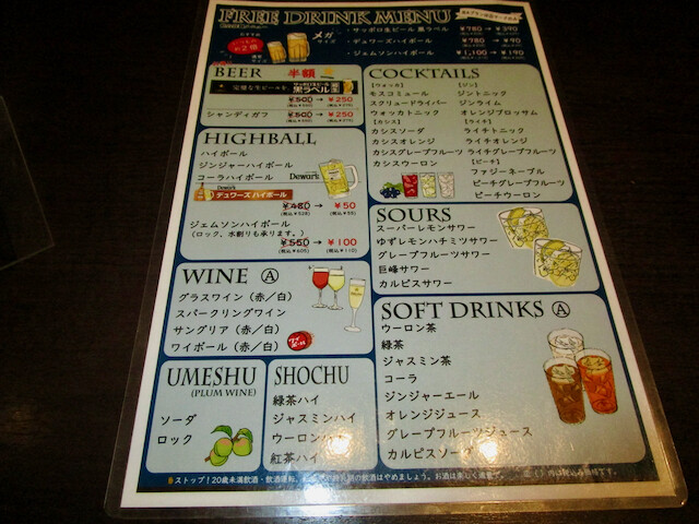 生ビール、ハイボール、スパーキングワイン、ワイン、梅酒、カクテル、サワー、ソフトドリンクと種類が多い。